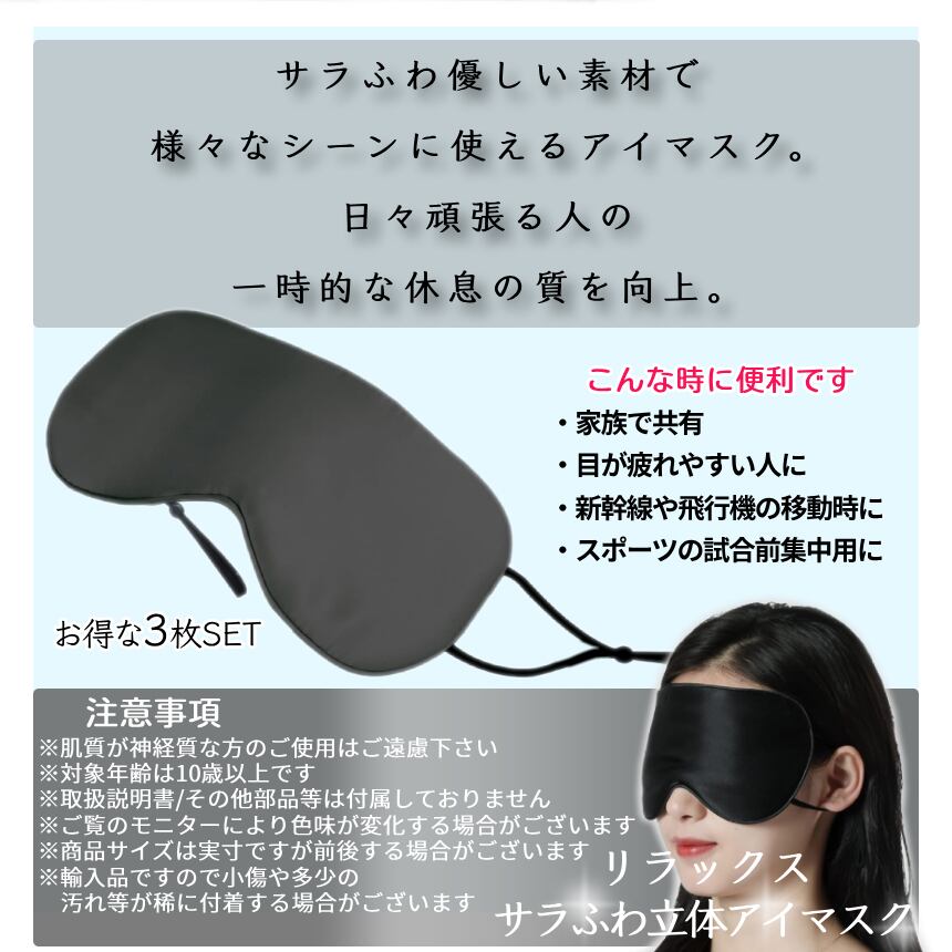 アイマスク 睡眠 ブラック 3枚 遮光 仮眠 休憩 リラックス 冷感 ひんやり サラサラ ふわふわ 耳掛け 光 遮断 男女兼用 軽量 持ち運び 出張 旅行 3-AISITEMASK