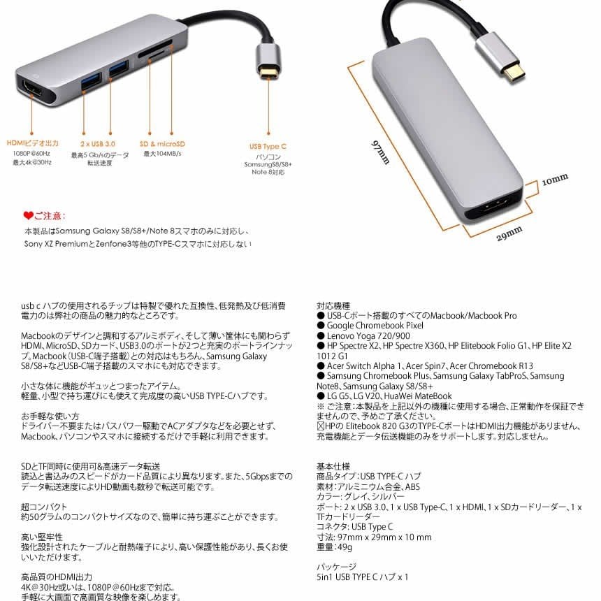 USB Type C ハブ 5ポート HDMI 高速ハブ USBハブ HDMIハブ HDMI変換 変換ハブ HUB 高速USB3.0 SD MicroSD カードリーダー CHUB5