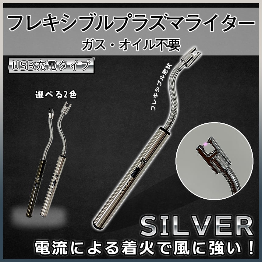 ロング プラズマライター フレキシブル シルバー 電子 ライター 点火 着火 プラズマ USB 充電 電気 防風 おしゃれ 軽量 薄型 アウトドア キャンプ BBQ MAGARAI-SV