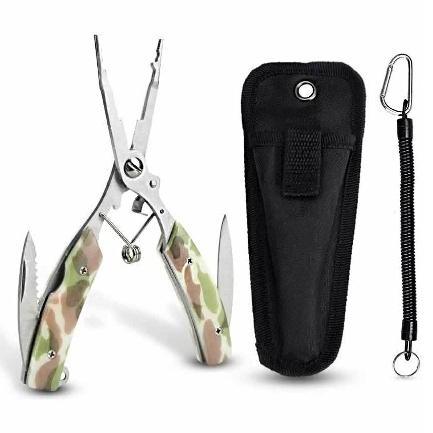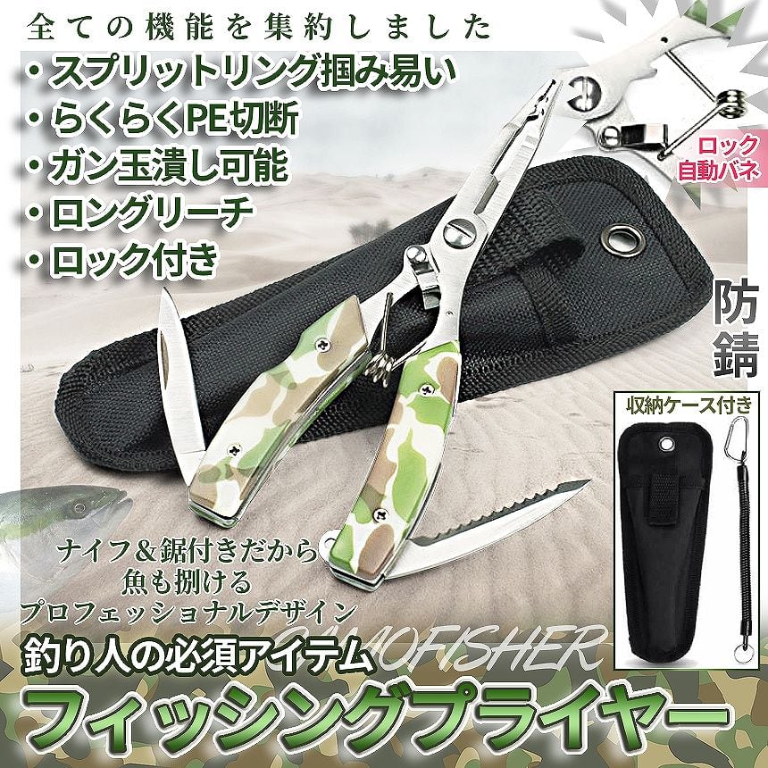 フィッシング プライヤー 釣り ペンチ 迷彩 柄 ケース付き 釣り用 ナイフ のこぎり 釣り具 針 フック 外し ライン PE カッター ガン玉 潰し カモフラ CAMOFISHER
