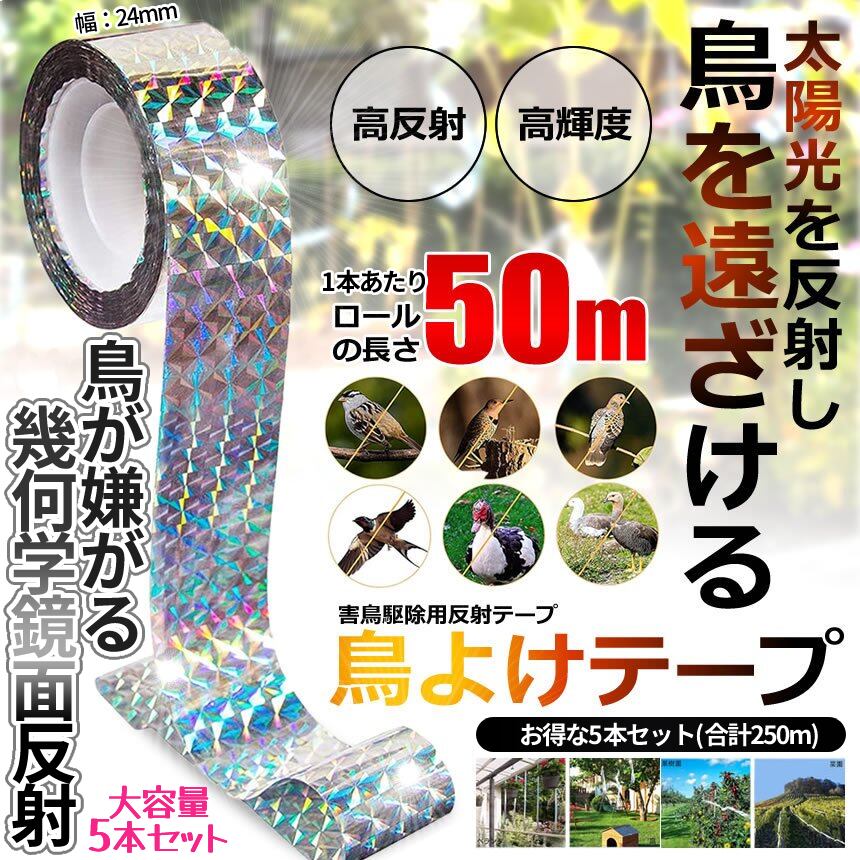 鳥よけ テープ 50m 5本 セット 貼るだけ 簡単 鳩 カラス 撃退 対策 鳥害 防鳥 鳥除け 吊り 下げ 庭 ガーデン 畑 家庭 菜園 ベランダ バルコニー5-TORIYOTAPE