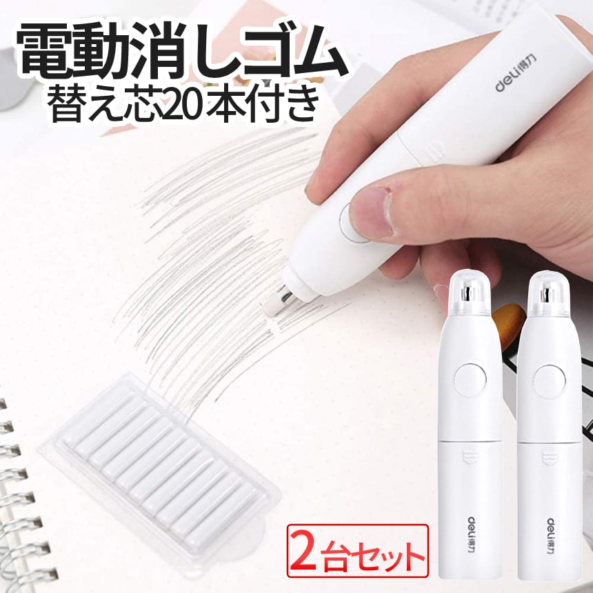 電動 消しゴム 高速 回転 字消し 2個 セット 電池 静音 よく消える 替え芯 20本 付き 学校 デッサン 絵画 製図 鉛筆 けしごむ ペン型 時短 文房具 2-DENKESIN