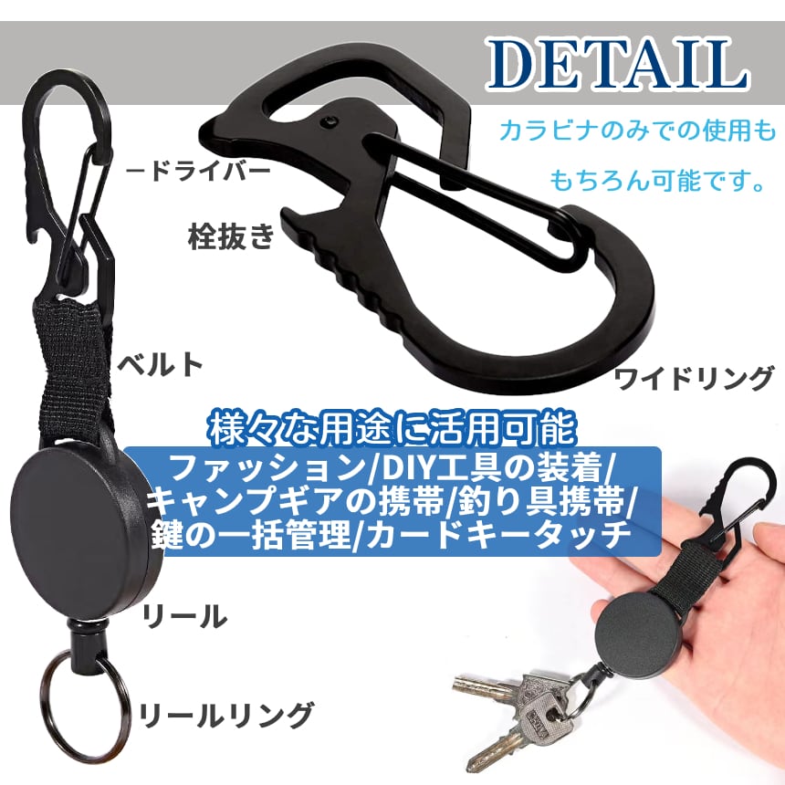 リール キーホルダー カラビナ 伸縮 60cm リール式 キーリング キーリール コードリール ドライバー 栓抜き 鍵 カギ 釣り キャンプ マルチ ツール 万能 KEYLILLE