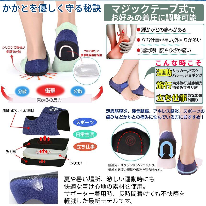 かかと サポーター ゲル パッド クッション 左右 2枚 セット 衝撃 吸収 踵 保護 カバー 中敷き 左足 右足 足首 固定 マジック テープ スポーツ 仕事 KAKAHOGO