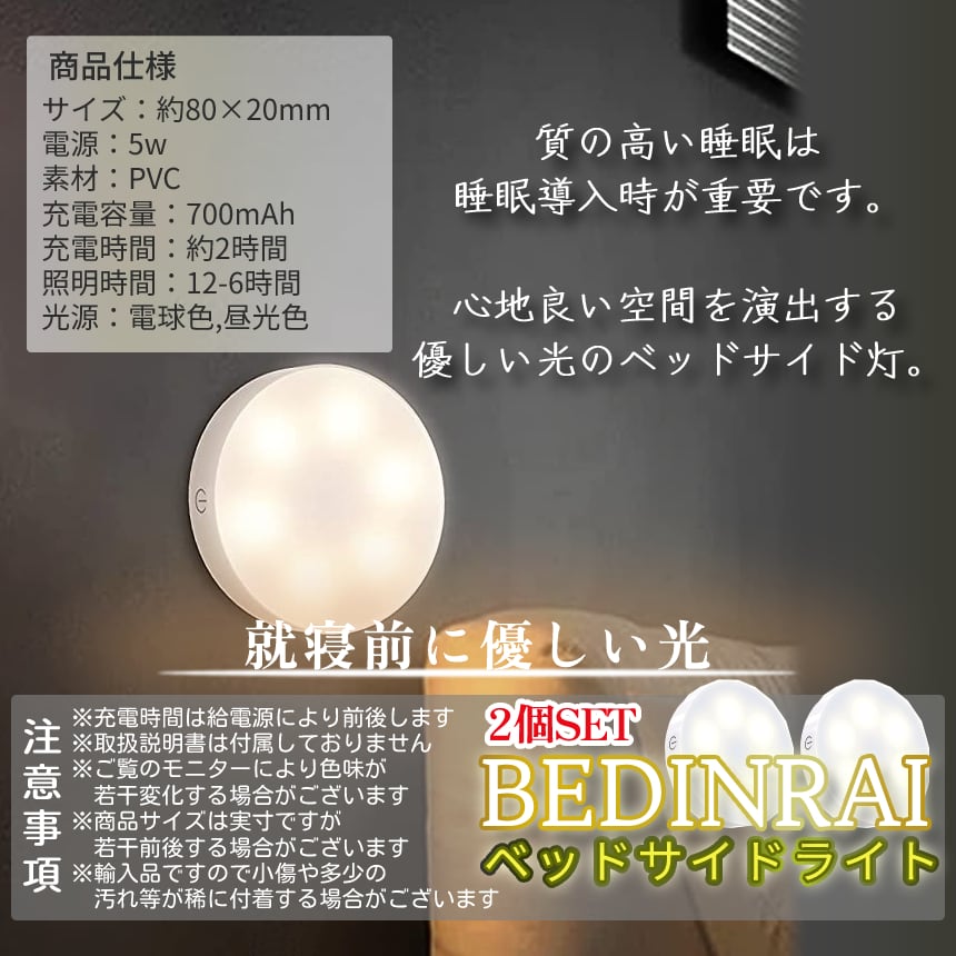 ベッド サイド LED ライト 2個 セット USB 充電 人感 センサー 感知 夜灯 デスクライト 光量 調節 光色 切替 磁石 災害 壁 ウォール 照明 取り付け 2-BEDINRAI
