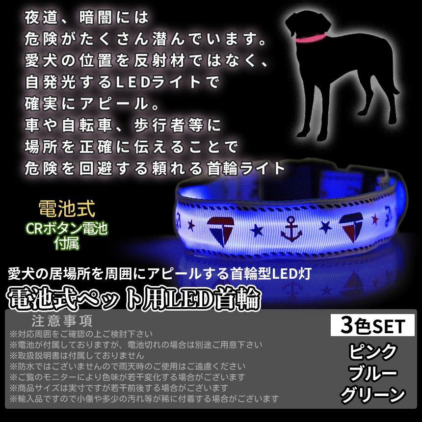 犬 首輪 光る LED ライト 3色 セット 点灯 点滅 ボタン 電池 小型 中型 大型 犬用 S M L サイズ 調整 可能 夜 散歩 安全 事故 防止 ペット かわいい PEKUBIRA