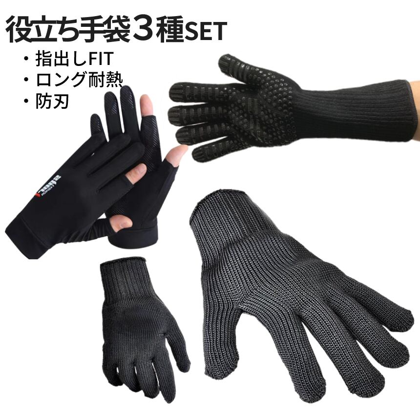 アウトドア 手袋 グローブ セット 3種類 FITグローブ 左右SET 防刃手袋 耐火手袋 合計5枚 釣り用 BBQ キャンプ ドライブ 指出し オープンフィンガー ODTEBUSET