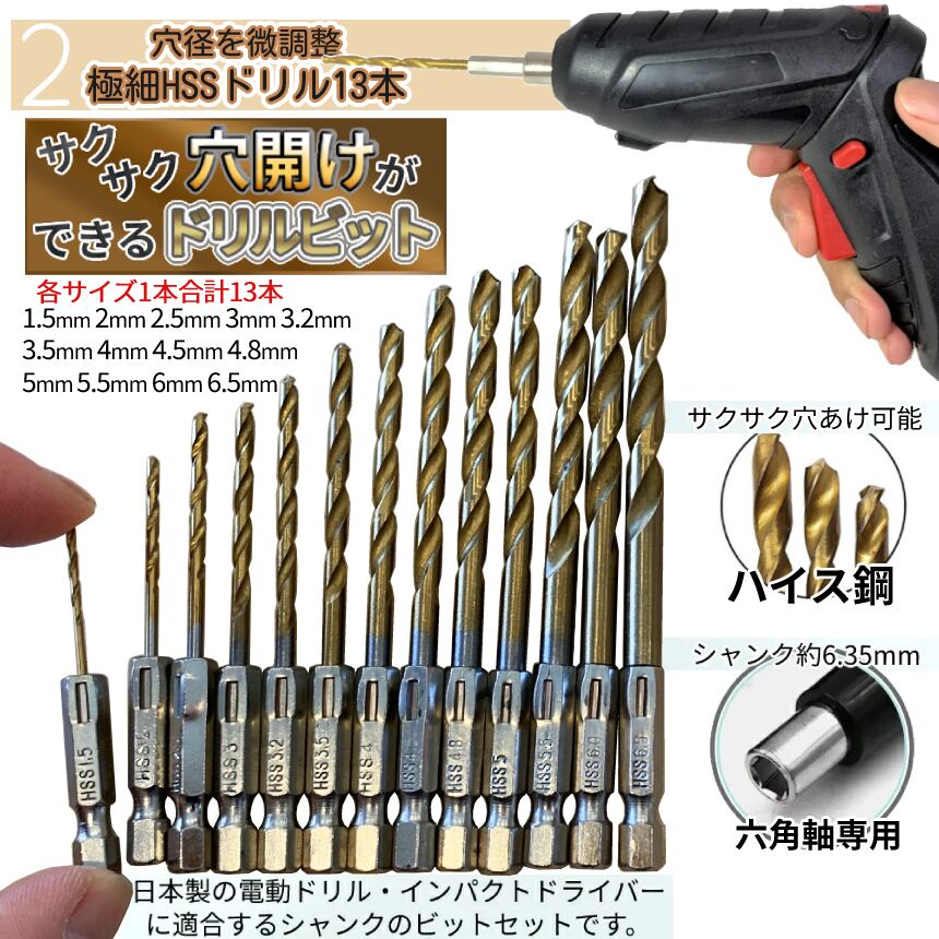 ドリル セット 研磨付き HSS鋼 1.5-6mm 極細ドリル13本 コンクリート 対応 ドリル 4本 研磨機 ドリルシャープナー 掘削 diy 工具 六角軸 穴あけ DORISET3