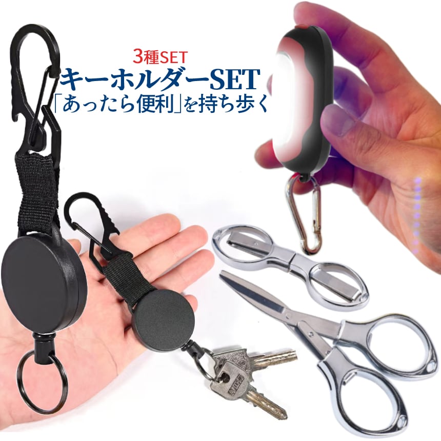 LED COB ライト キーホルダー 折畳み ハサミ 伸縮 リール 付き ワイヤー 3種セット カラビナ アウトドア キャンプギア 栓抜き 鋏 ハンディライト KIHOSET2