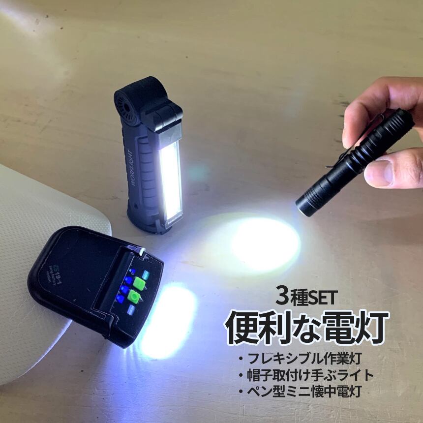 作業灯 セット 3種類 LED ライト ペン型 ハンディ 懐中電灯 小型 ミニ 点灯 点滅 キャップライト 帽子 ペンライト 投光器 アウトドア キャンプ 携帯 DENTOSET