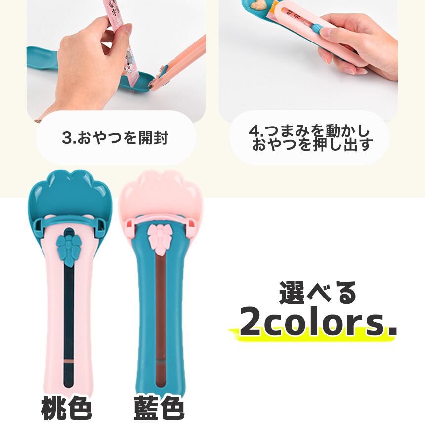 スティック型のおやつを挟み、つまみで押し出す簡単な使用方法♪