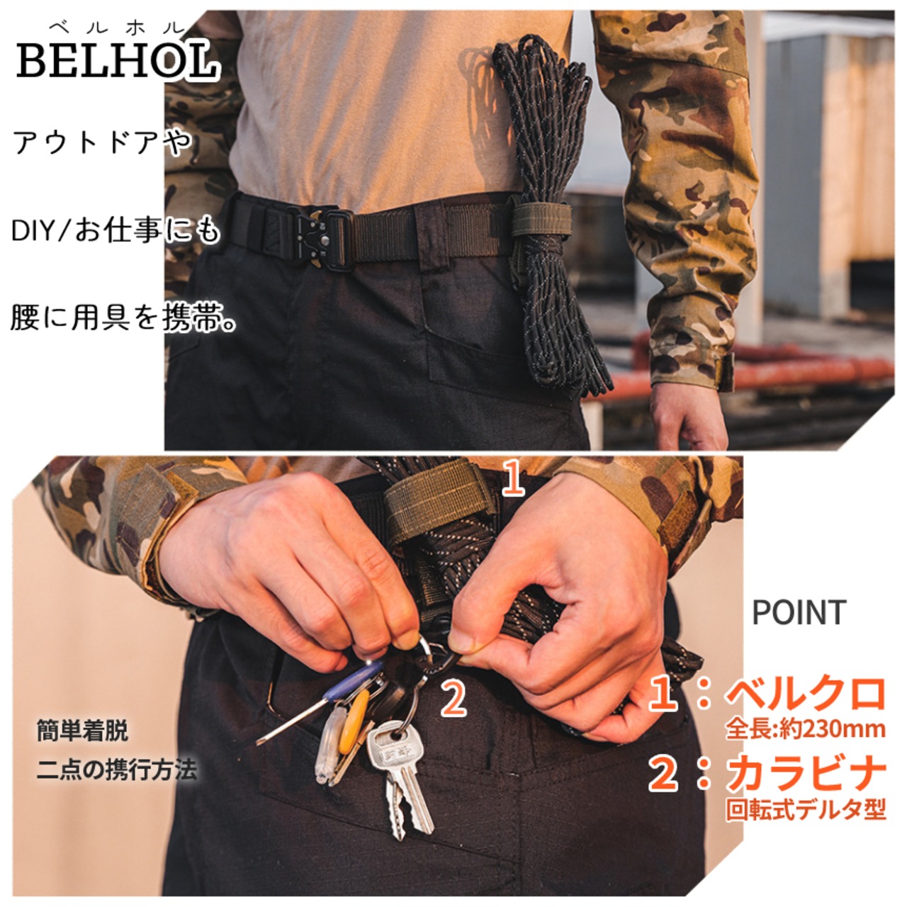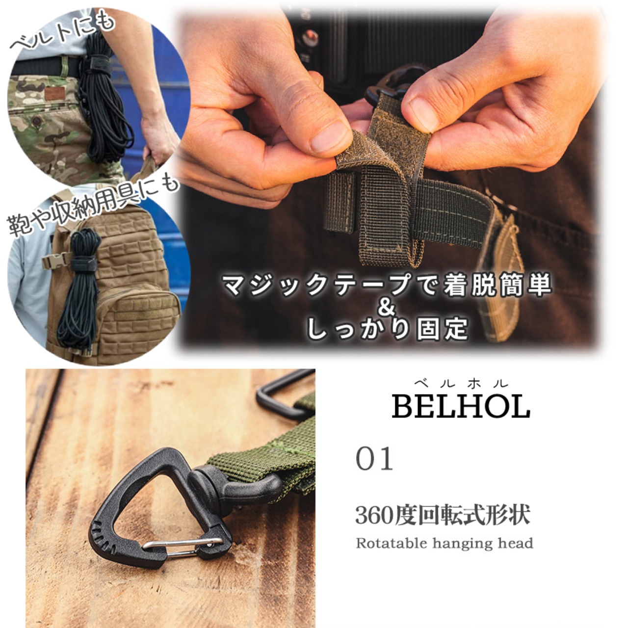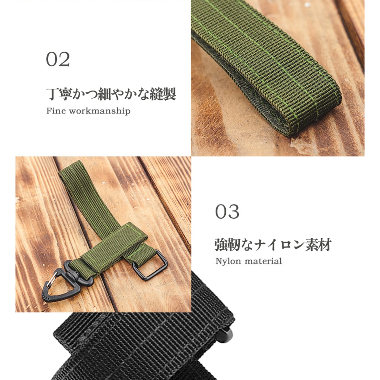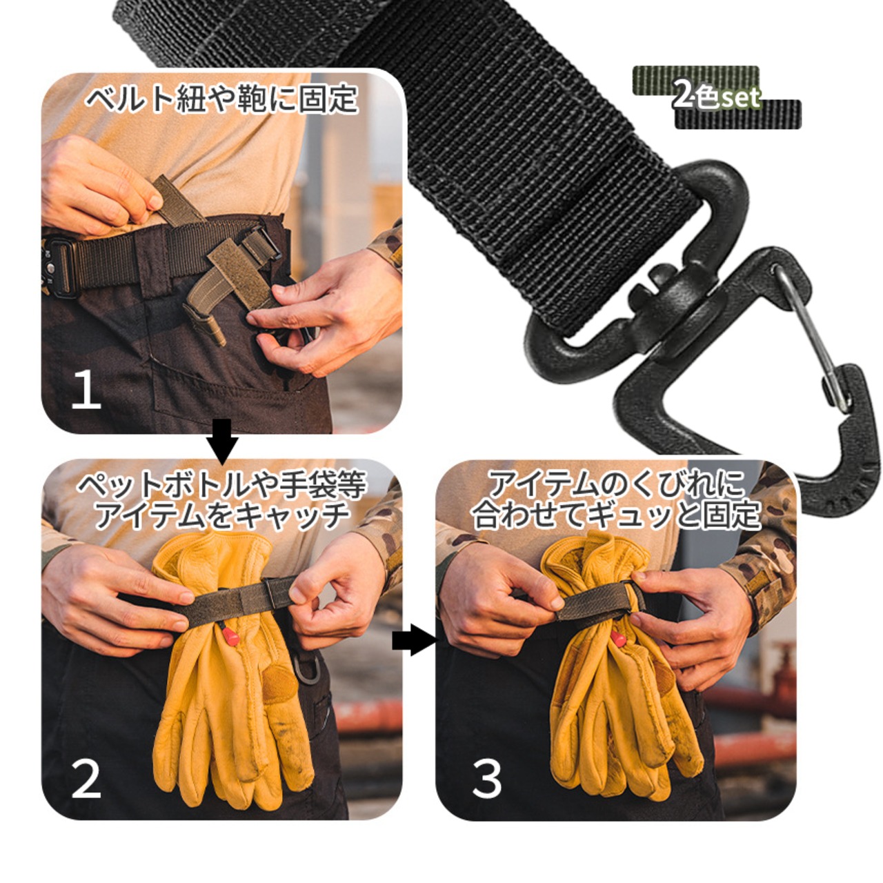 カラビナ付き マルチ ベルトホルダー 2色 黒 緑 携帯ベルト 携行 腰ベルト穴 鞄取付け 汎用ストラップ ペットボトル グローブ アウトドア キャンプギア 2-BELHOL