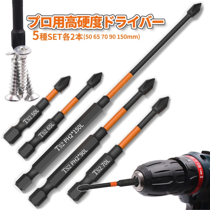 ドライバー ビット 5種 2pcsセット 50mm-150mm プラスドライバー 漆黒 Black ヘックスローブ 六角軸 ネジ 電動 ドライバー インパクト 工具 DIY 2-BKDORA5
