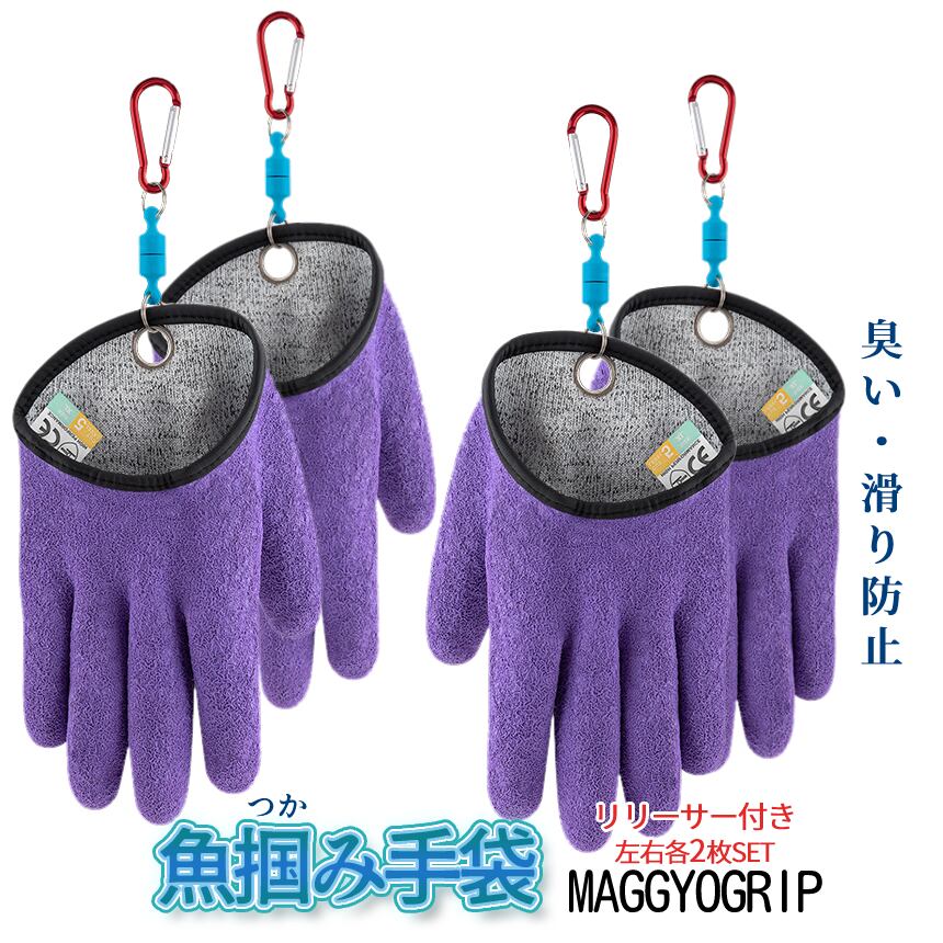 魚用 手袋 フィッシング グローブ 魚 グリップ 魚掴み 両手 2セット マグネットリリーサー 磁石 滑り 防止 カラビナ パープル 臭い 防止 右手 左手 2-MAGGYOGRIP