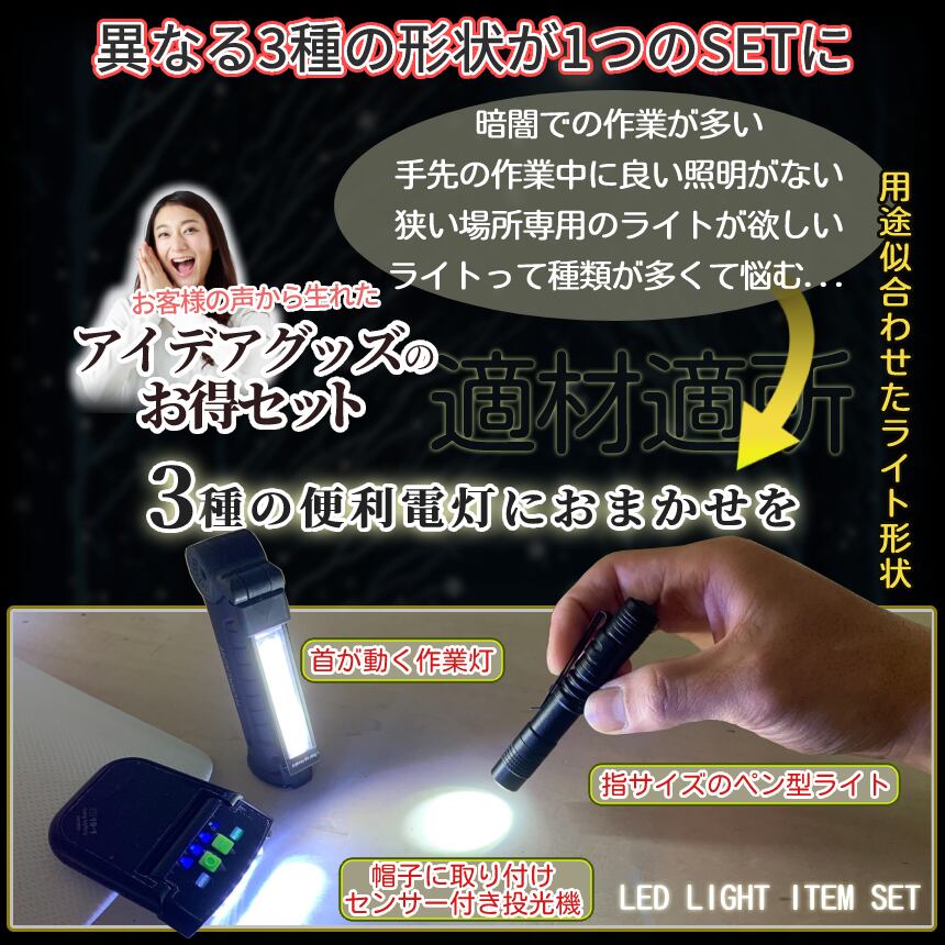 作業灯 セット 3種類 LED ライト ペン型 ハンディ 懐中電灯 小型 ミニ 点灯 点滅 キャップライト 帽子 ペンライト 投光器 アウトドア キャンプ 携帯 DENTOSET