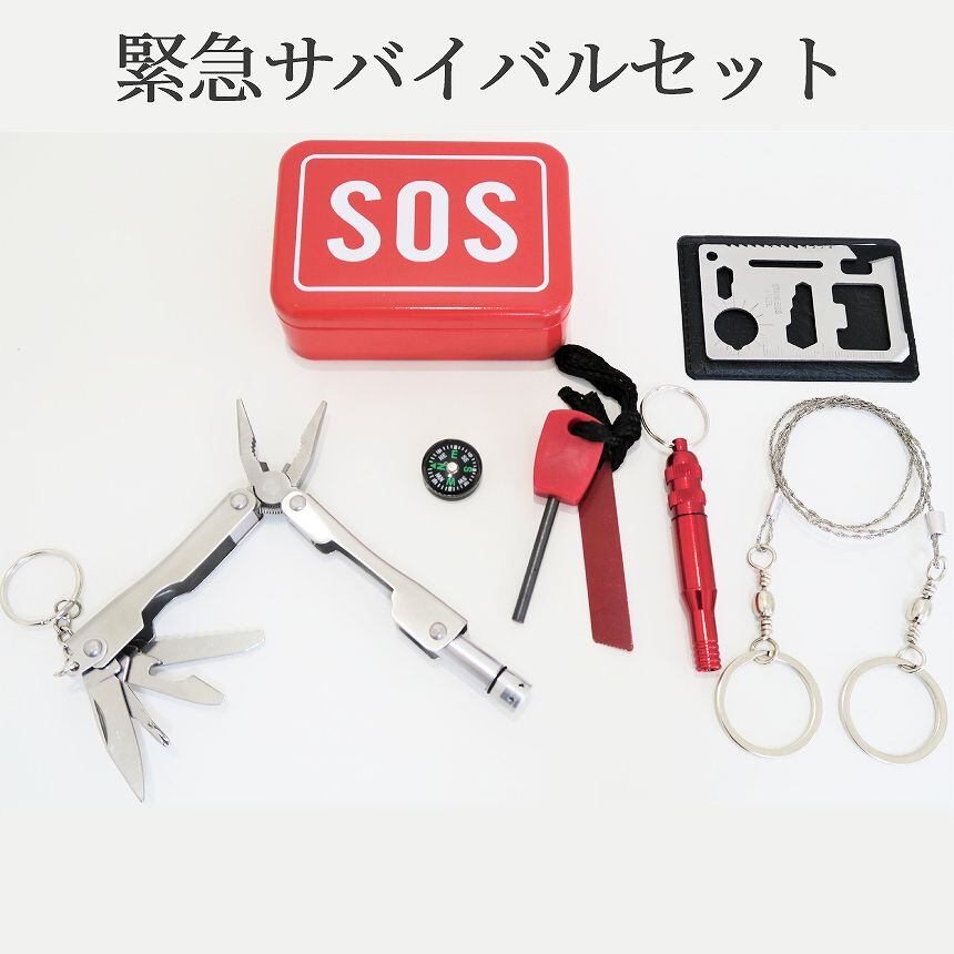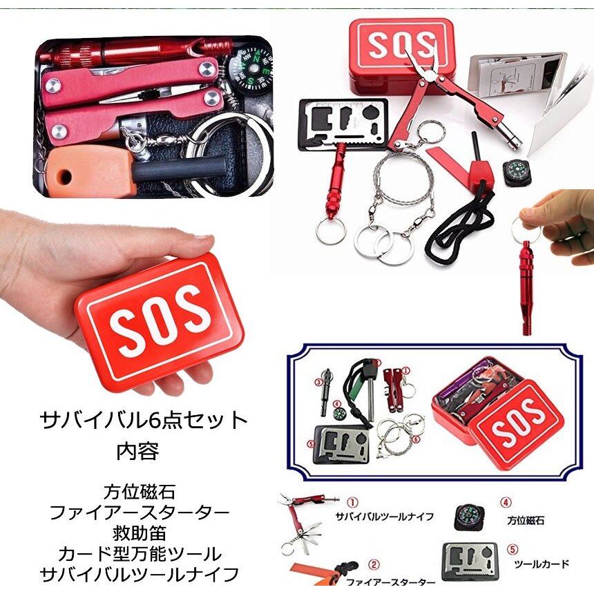 サバイバル ツール 6点 セット 災害 対策 救助笛 方位磁石 ワイヤーのこぎり ナイフ カード型ツール ファイアー スターター アウトドア キャンプ 登山 SABASET