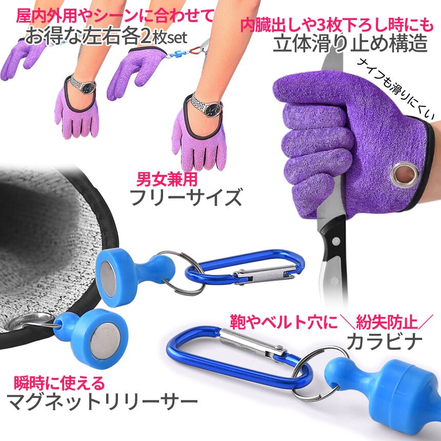 魚用 手袋 フィッシング グローブ 魚 グリップ 魚掴み 両手 2セット マグネットリリーサー 磁石 滑り 防止 カラビナ パープル 臭い 防止 右手 左手 2-MAGGYOGRIP