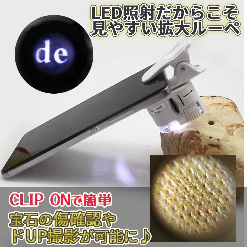 スマホ用 ルーペ 拡大 60倍 LED ライト スマホ カメラ クリップ マイクロ スコープ 拡大鏡 マクロ 撮影 宝石 鑑定 傷 確認 紙幣 SNS 投稿 アップ ズーム SMARUPE
