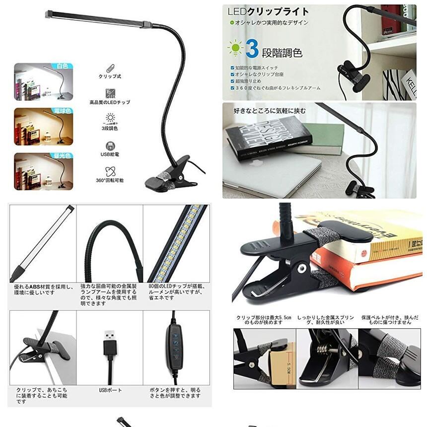 フレキシブル クリップ デスク LED ライト 80灯 USB 給電 卓上 3色 調色 暖色 昼光色 白色 10段階 調光 回転 コンパクト 軽量 読書 試験 勉強 テスト CLIPLIGHT