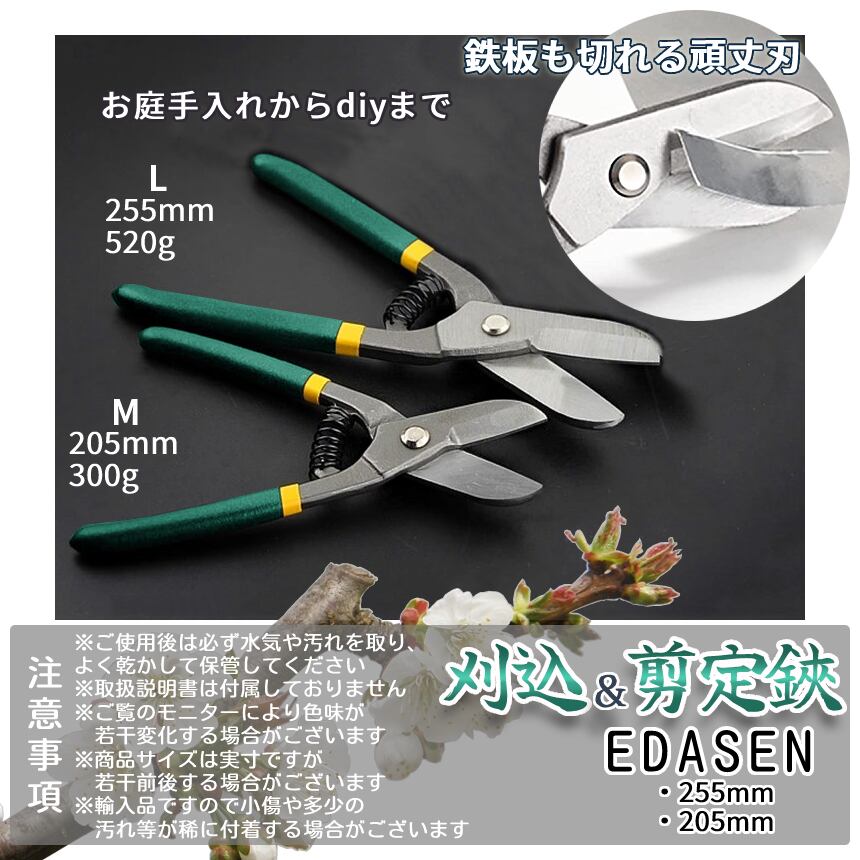 剪定ばさみ 刈り込み 205mm 極太刃 枝切り Mサイズ 刈込鋏 剪定鋏 はさみ 衝撃吸収 スプリング 庭 木 枝 手入れ 園芸用 植物 盆栽 ガーデニング DIY EDASEN-GR-M