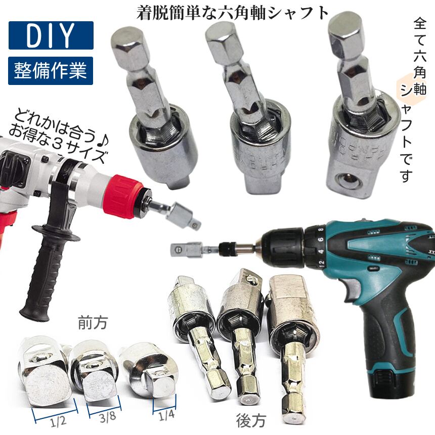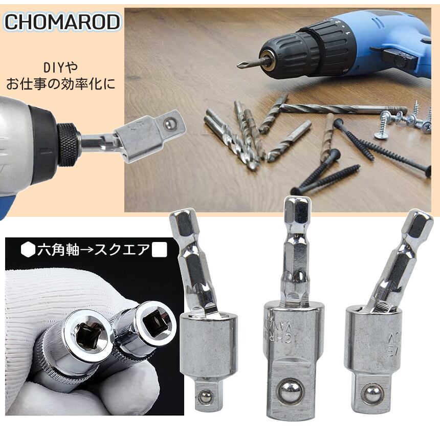 ソケットアダプター 3本セット 1/4 3/8 1/2 ちょっと曲がる ソケット 変換 アダプター 電動ドライバー 電動ドリル インパクト 6.35mm 六角軸 工具 DIY CHOMAROD