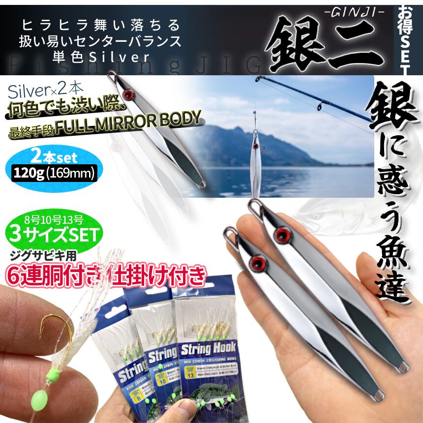 ジグサビキセット ジグ 120g 2本 バーチカル ミラー 鏡面 シルバー 6連 ジグサビキ 胴付き仕掛け 3種 サビキ 針 釣り 8号 10号 13号 メタルジグ JIGSASET-D