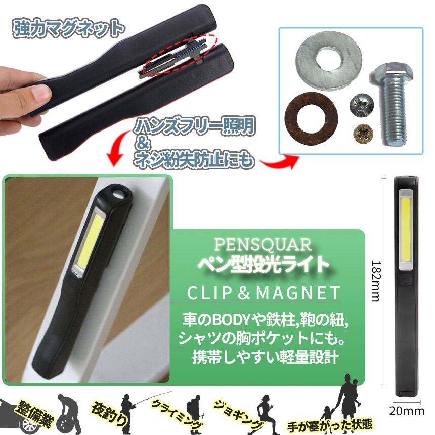 ペン型 LEDライト ポケットライト 2本 クリップ LED ライト 懐中電灯 電池式 マグネット ハンディ 照明 COB 面発光 アウトドア 防災 持ち運び 携帯 2-PENSQUAR