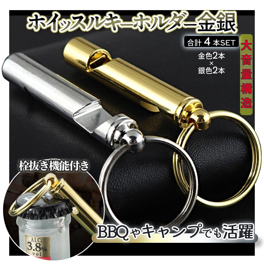 ホイッスル キーホルダー 金銀 2色各2本 大音量 リング 栓抜き アウトドア用 カギ防錆 キーチェーン キーリング 小型 SIMPLE キャンプギア オシャレ 2-KINGINWHI